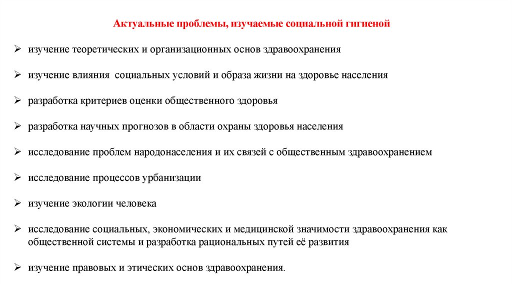 Актуальные проблемы, изучаемые социальной гигиенойизучение теоретических и организационных основ здравоохранения