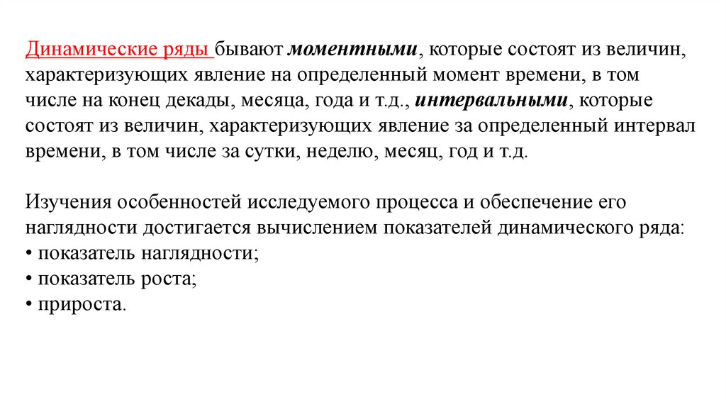 Динамические ряды бывают моментными, которые состоят из величин,характеризующих явление на определенный момент времени, в том