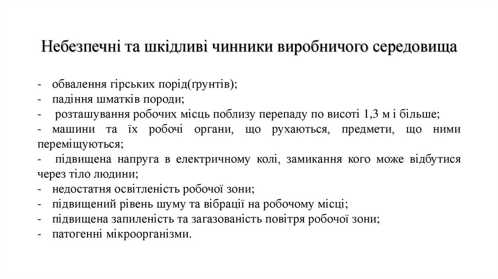 Небезпечні та шкідливі чинники виробничого середовища- обвалення гірських порід(ґрунтів);
