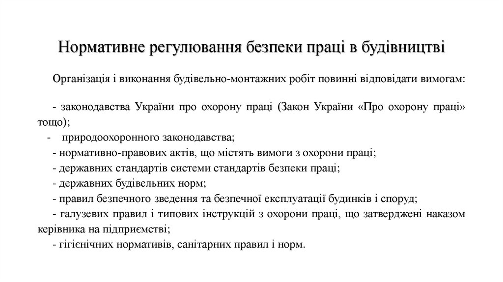 Нормативне регулювання безпеки праці в будівництвіОрганізація і виконання будівельно-монтажних робіт повинні відповідати вимогам: