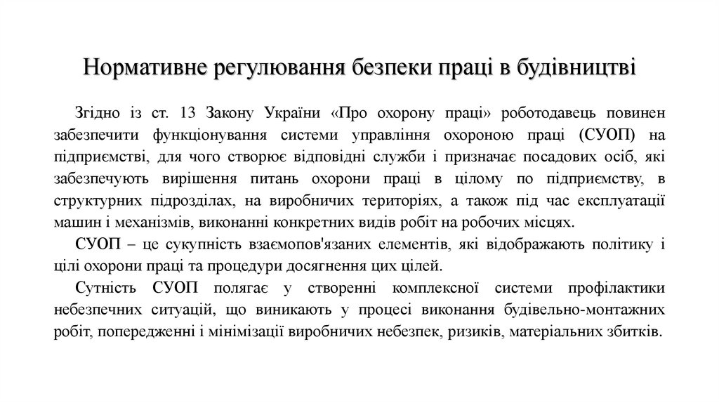 Нормативне регулювання безпеки праці в будівництвіЗгідно із ст. 13 Закону України «Про охорону праці» роботодавець повинен
