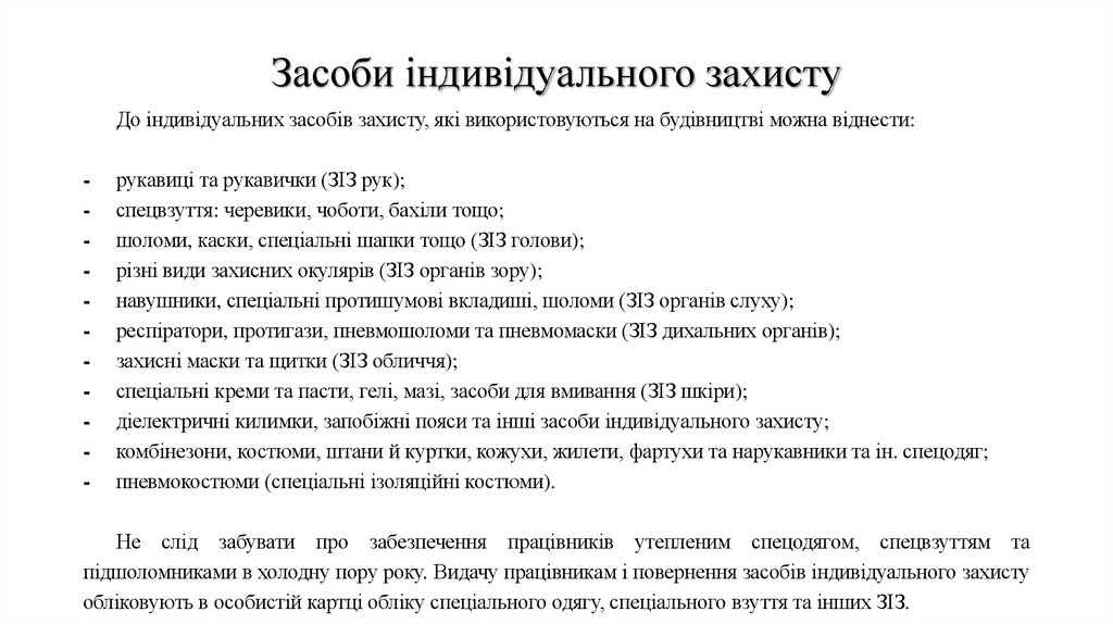 Засоби індивідуального захистуДо індивідуальних засобів захисту, які використовуються на будівництві можна віднести: