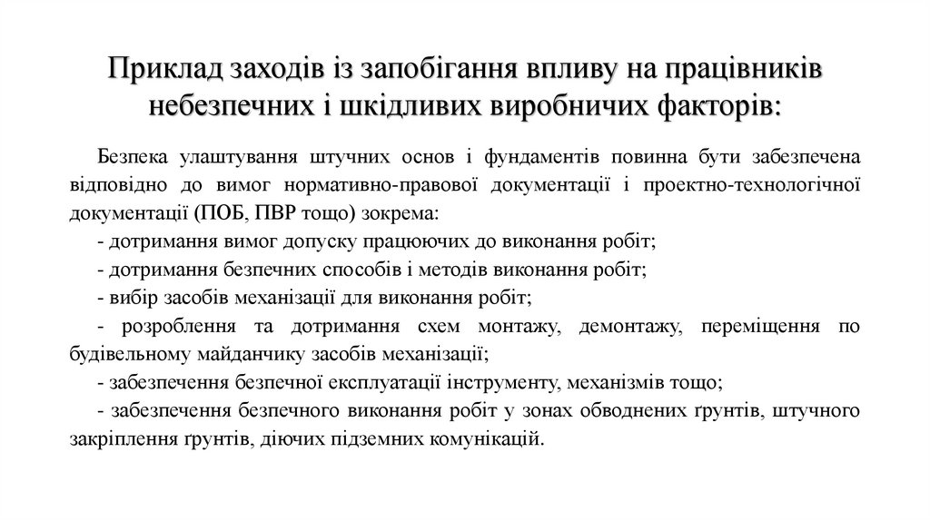 Приклад заходів із запобігання впливу на працівниківнебезпечних і шкідливих виробничих факторів: