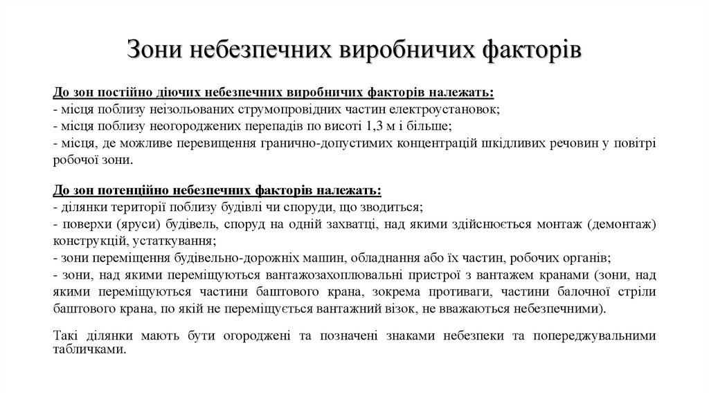 Зони небезпечних виробничих факторівДо зон постійно діючих небезпечних виробничих факторів належать: