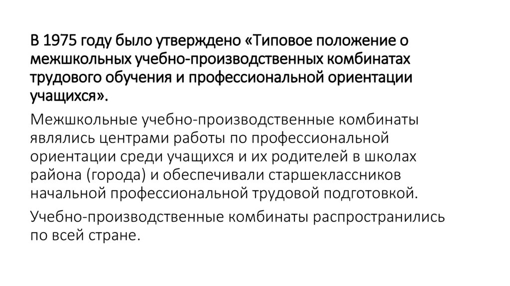 В 1975 году было утверждено «Типовое положение омежшкольных учебно-производственных комбинатах