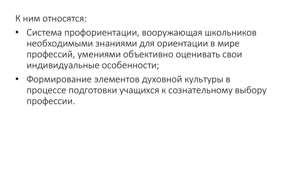 К ним относятся:• Система профориентации, вооружающая школьников