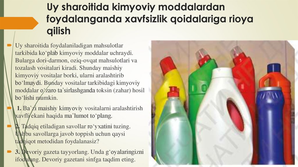 Uy sharoitida kimyoviy moddalardanfoydalanganda xavfsizlik qoidalariga rioya