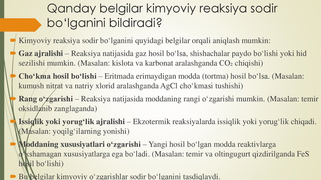 Bu belgilar kimyoviy o‘zgarishlar sodir bo‘lganini tasdiqlaydi.
