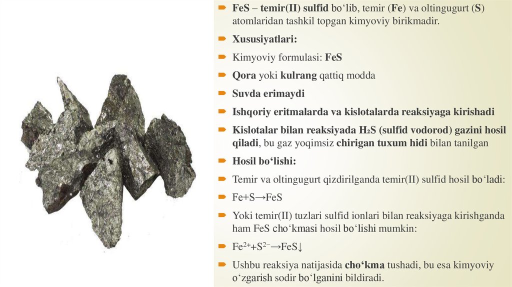 o‘xshamagan xususiyatlarga ega bo‘ladi. (Masalan: temir va oltingugurt qizdirilganda FeS
