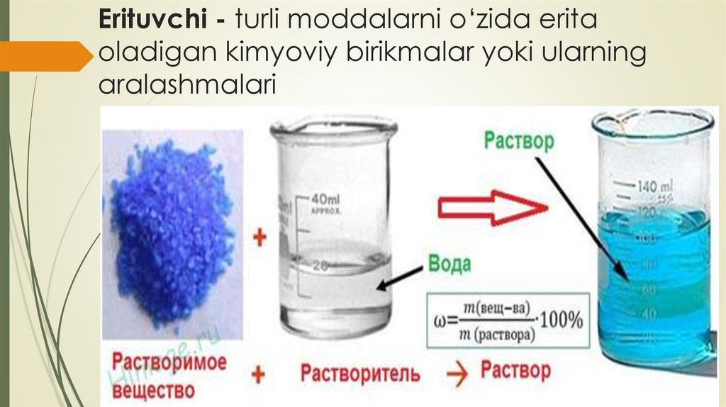 Erituvchi - turli moddalarni o‘zida eritaoladigan kimyoviy birikmalar yoki ularning