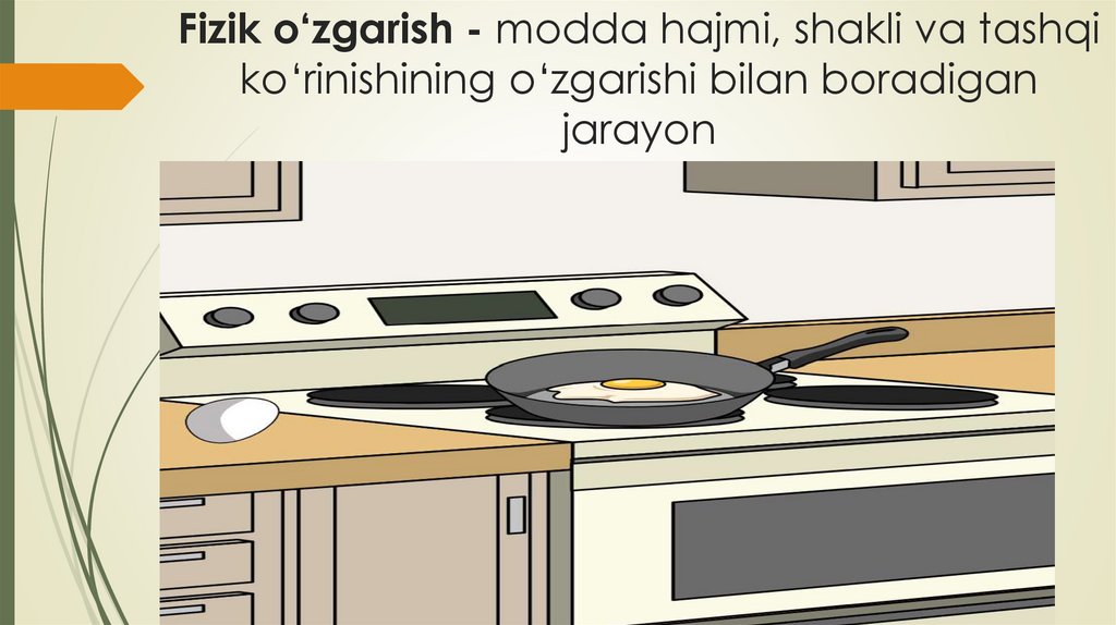 Fizik o‘zgarish - modda hajmi, shakli va tashqiko‘rinishining o‘zgarishi bilan boradigan