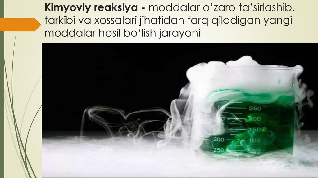 Kimyoviy reaksiya - moddalar o‘zaro ta’sirlashib,tarkibi va xossalari jihatidan farq qiladigan yangi