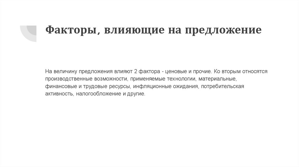 Факторы, влияющие на предложениеНа величину предложения влияют 2 фактора - ценовые и прочие. Ко вторым относятся