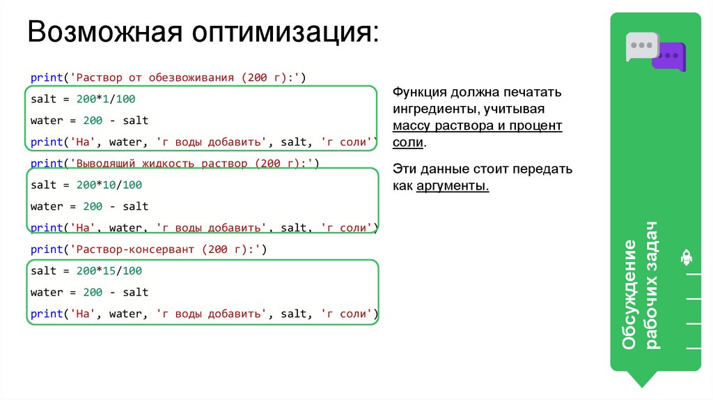 Возможная оптимизация:print('Раствор от обезвоживания (200 г):')