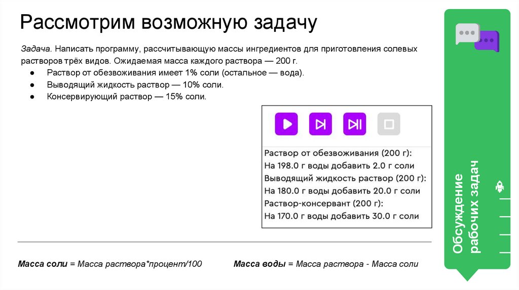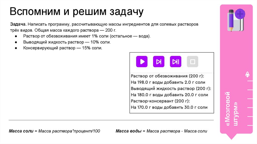 Задача. Написать программу, рассчитывающую массы ингредиентов для приготовления солевых