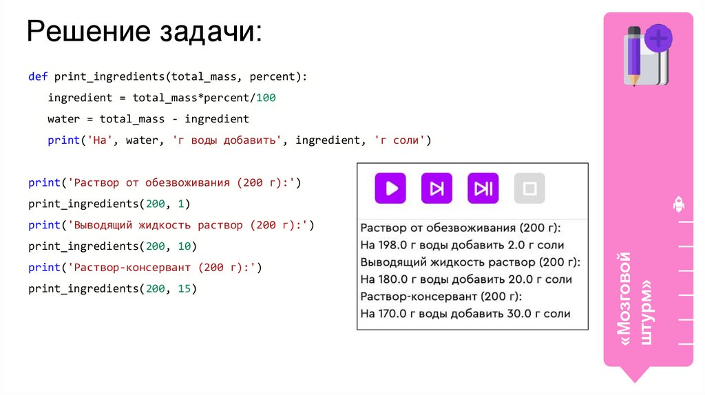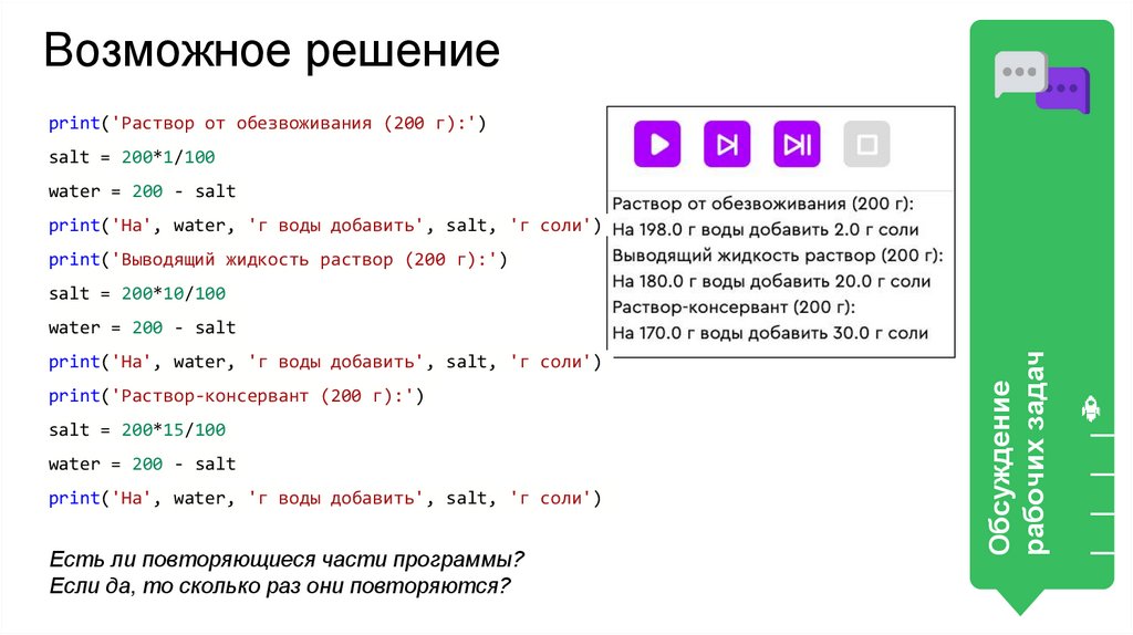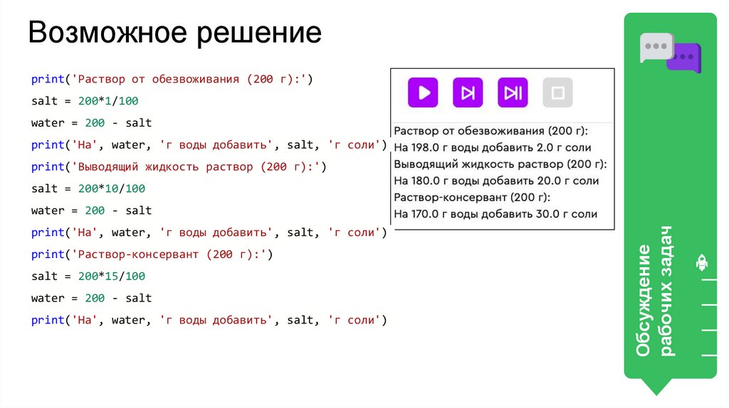 print('На', water, 'г воды добавить', salt, 'г соли') соли.