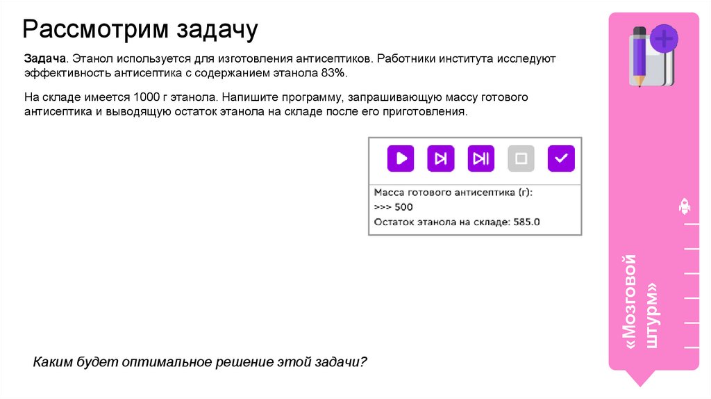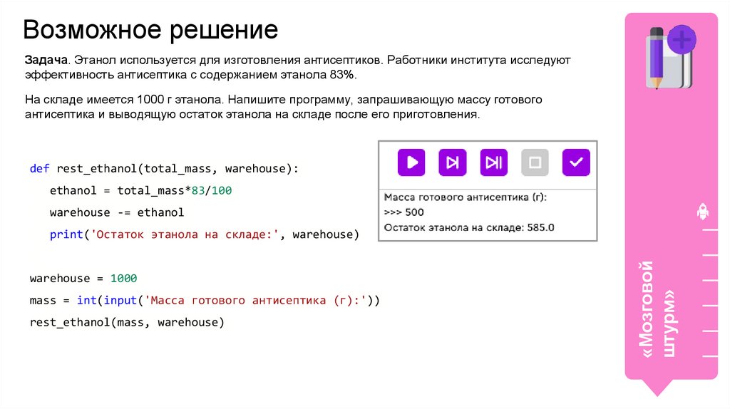Возможное решениеЗадача. Этанол используется для изготовления антисептиков. Работники института исследуют