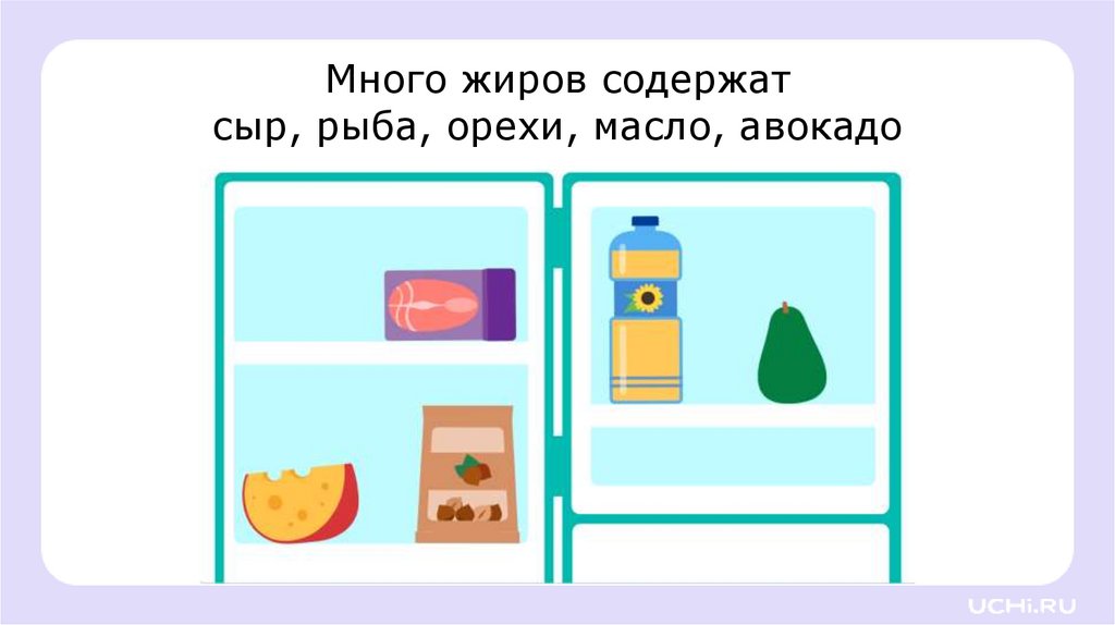 Много жиров содержатсыр, рыба, орехи, масло, авокадо