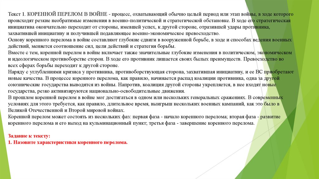 Текст 1. КОРЕННОЙ ПЕРЕЛОМ В ВОЙНЕ - процесс, охватывающий обычно целый период или этап войны, в ходе которогопроисходят резкие необратимые изменения в военно-политической и стратегической обстановке. В ходе его стратегическая