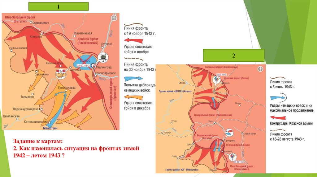 Карты 1 и 2 – как изменилась ситуация на фронтах зимой 1942 – летом 1943?