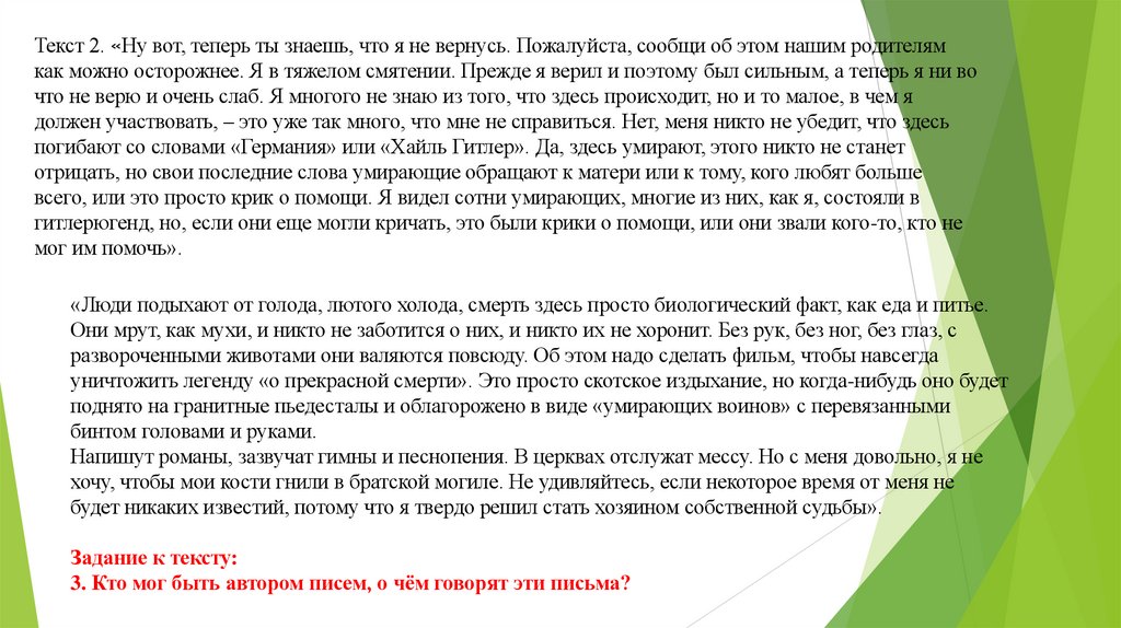 Текст 2. «Ну вот, теперь ты знаешь, что я не вернусь. Пожалуйста, сообщи об этом нашим родителямкак можно осторожнее. Я в тяжелом смятении. Прежде я верил и поэтому был сильным, а теперь я ни во