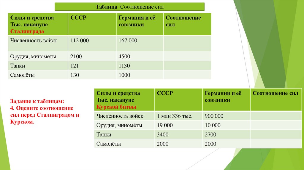 Таблица - оцените соотношение сил перед Сталинградом и Курском.