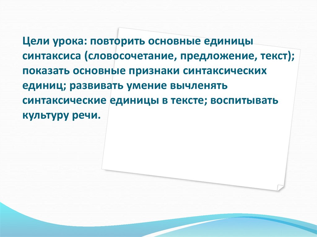 2. Цели урока: повторить основные единицы синтаксиса (словосочетание, предложение, текст); показать основные признаки