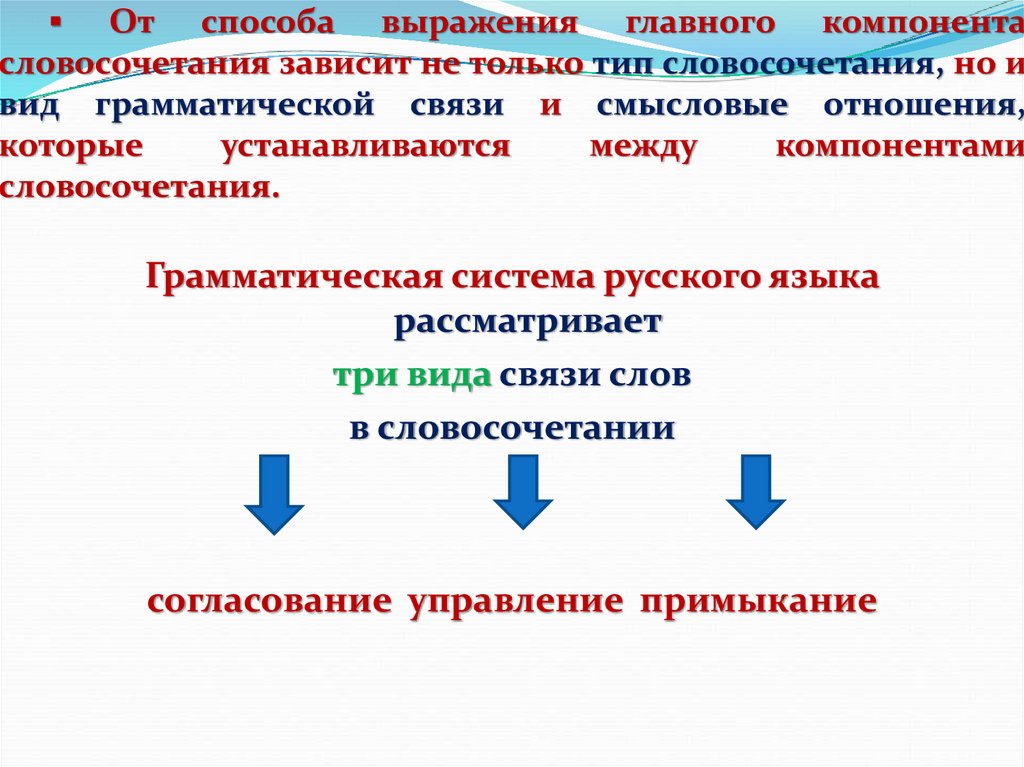 15. ▪ От способа выражения главного компонента словосочетания зависит не только тип словосочетания, но и вид грамматической связи и