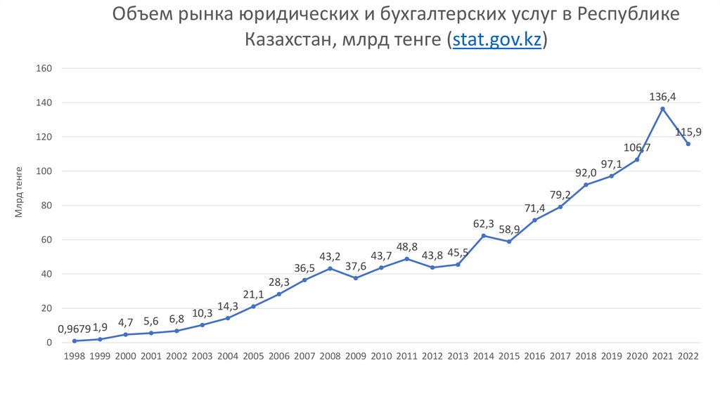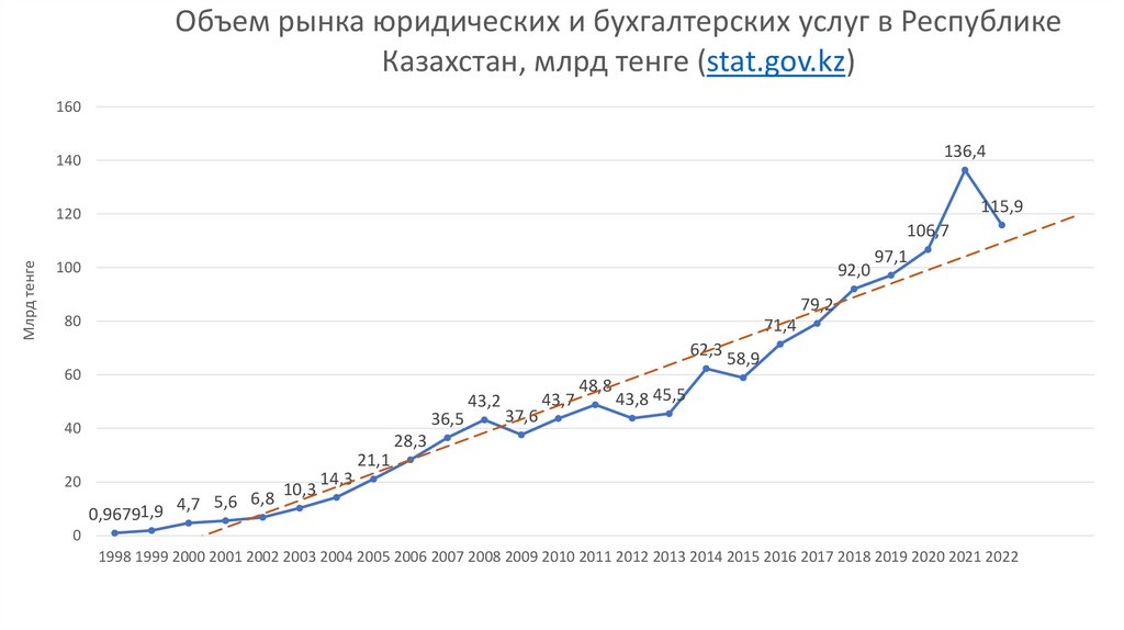 Объем рынка юридических и бухгалтерских услуг в РеспубликеКазахстан, млрд тенге (stat.gov.kz)