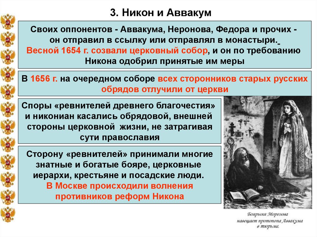 Своих оппонентов - Аввакума, Неронова, Федора и прочих он отправил в ссылку или отправлял в монастыри.Весной 1654 г. созвали церковный собор, и он по требованию