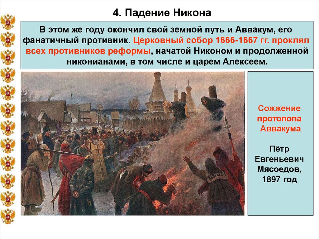 В этом же году окончил свой земной путь и Аввакум, егофанатичный противник. Церковный собор 1666-1667 гг. проклял