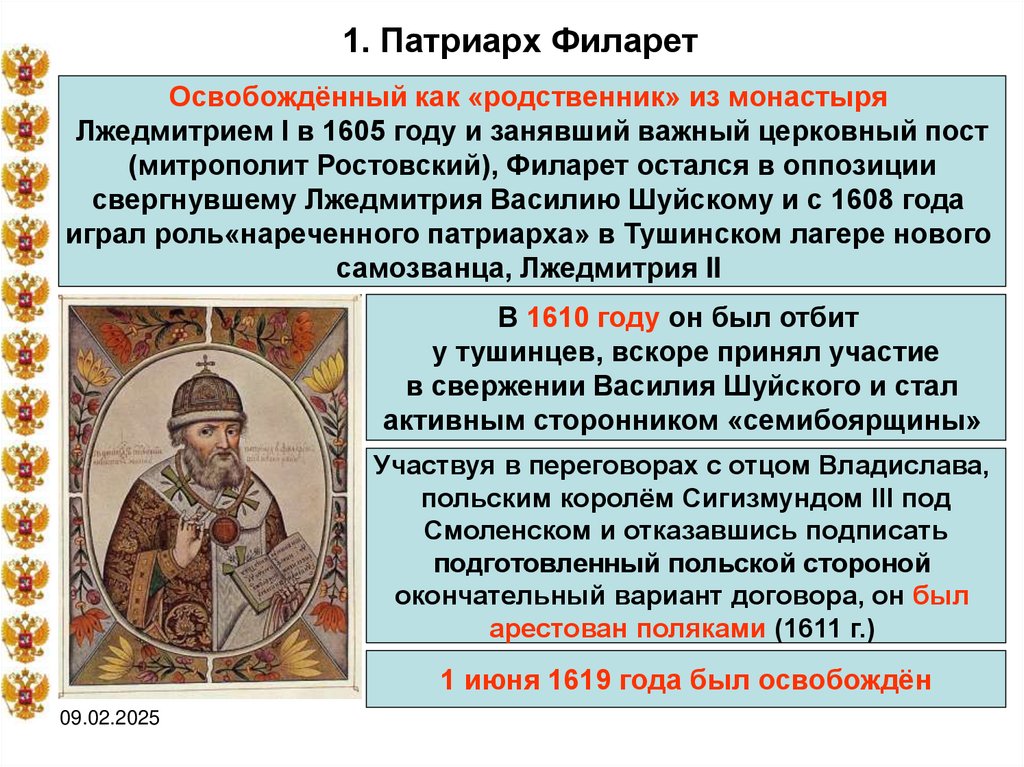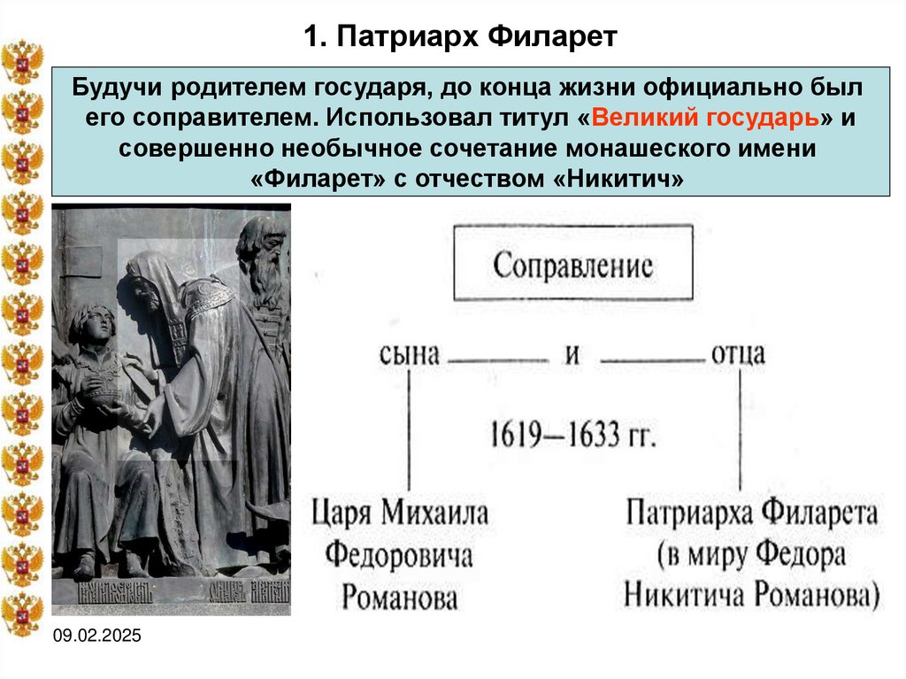 Патриарх Филарет (в миру Федор Никитич Романов) (ок. 1554 - 1 октября 1633) - церковный и политическийдеятель Смутного времени и последующей эпохи