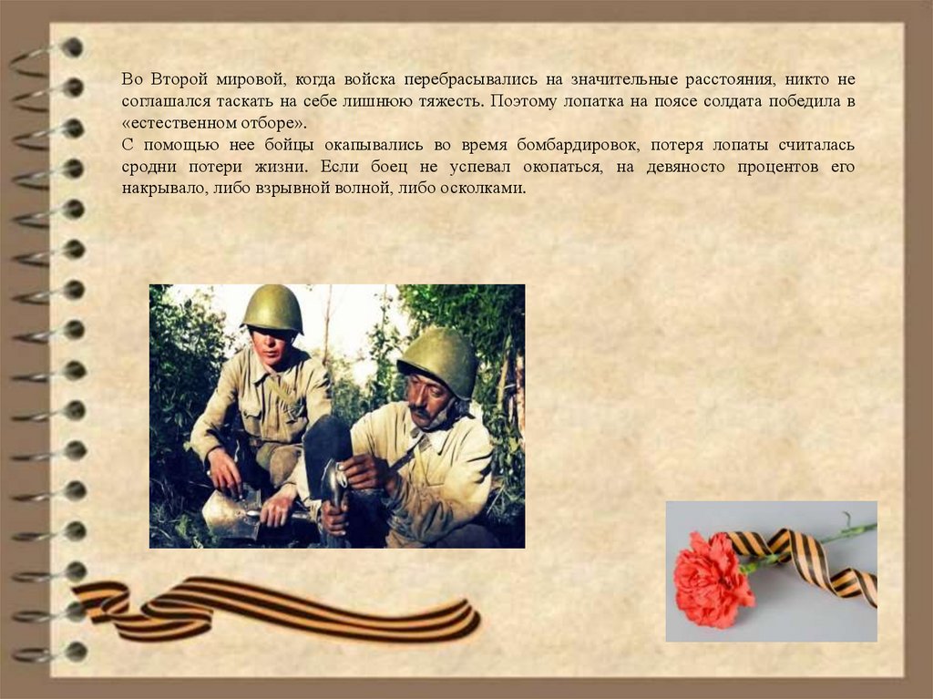 Во Второй мировой, когда войска перебрасывались на значительные расстояния, никто несоглашался таскать на себе лишнюю тяжесть. Поэтому лопатка на поясе солдата победила в