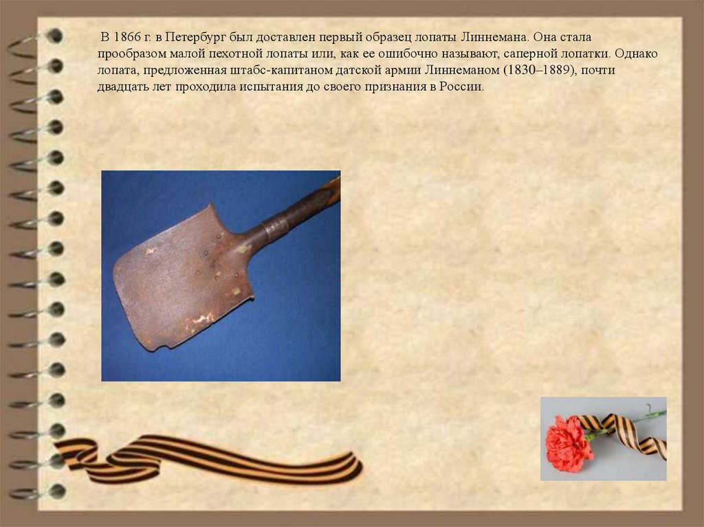 В 1866 г. в Петербург был доставлен первый образец лопаты Линнемана. Она сталапрообразом малой пехотной лопаты или, как ее ошибочно называют, саперной лопатки. Однако
