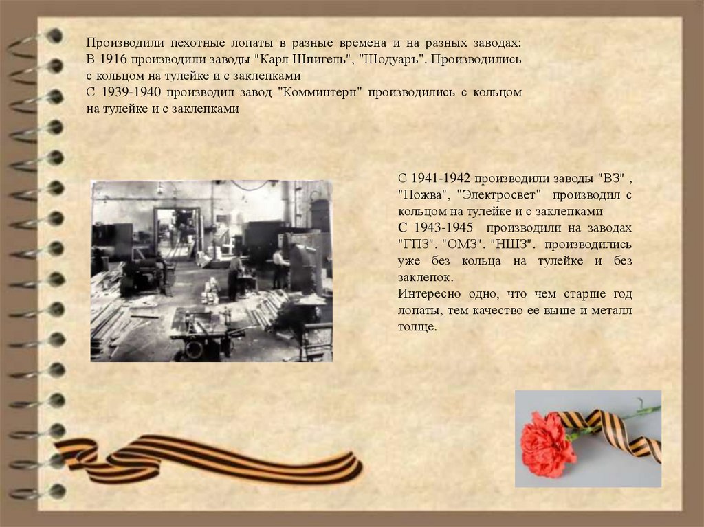 Производили пехотные лопаты в разные времена и на разных заводах:В 1916 производили заводы "Карл Шпигель", "Шодуаръ". Производились