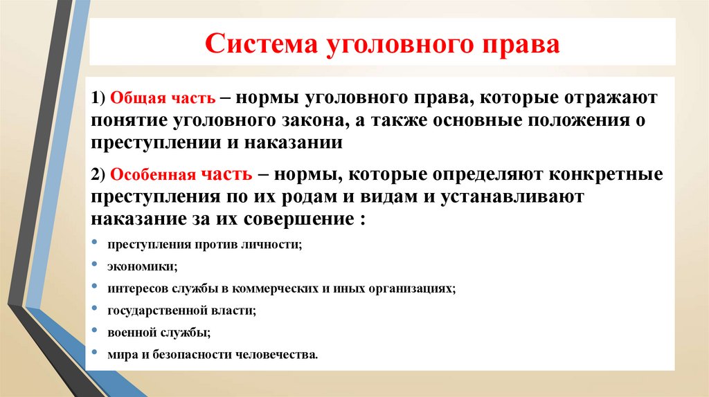 Система уголовного права1) Общая часть – нормы уголовного права, которые отражают