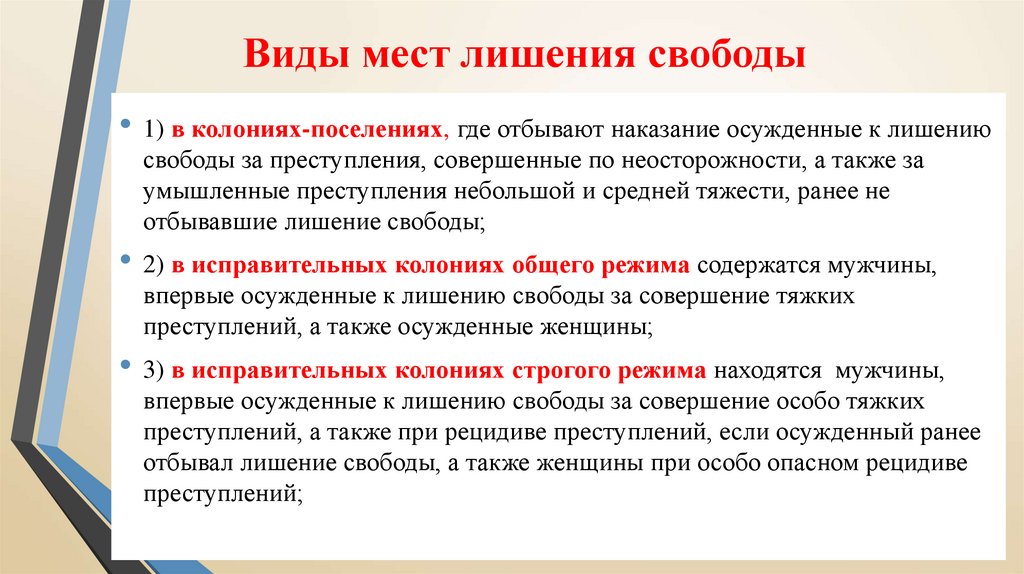 Виды мест лишения свободы• 1) в колониях-поселениях, где отбывают наказание осужденные к лишению