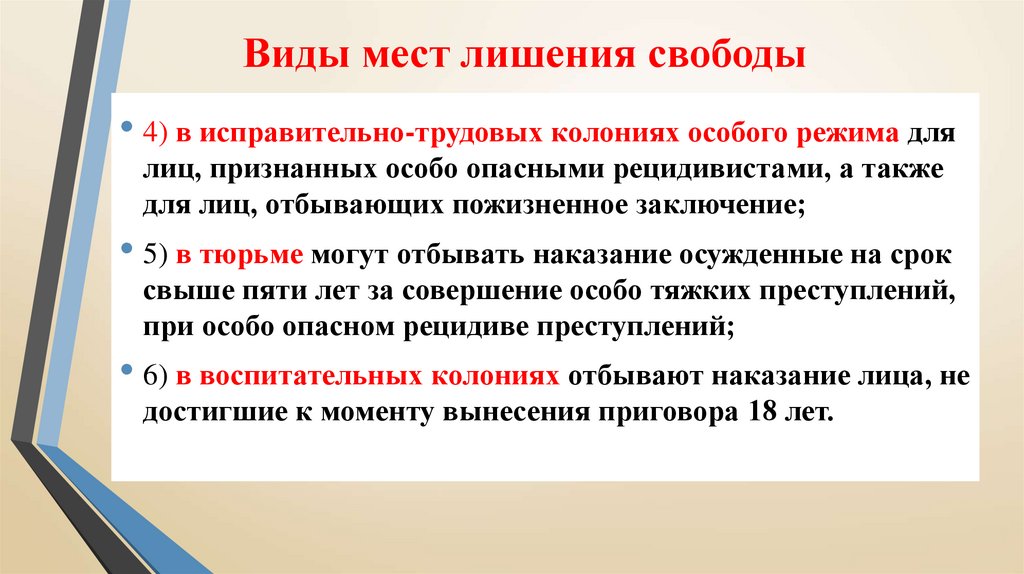 Виды мест лишения свободы• 4) в исправительно-трудовых колониях особого режима для