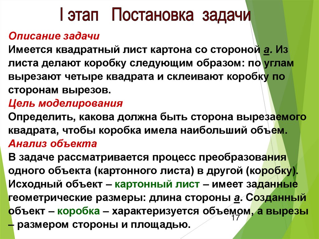 Описание задачиИмеется квадратный лист картона со стороной а. Из