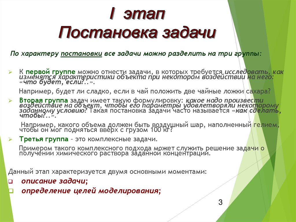 По характеру постановки все задачи можно разделить на три группы:К первой группе можно отнести задачи, в которых требуется исследовать, как