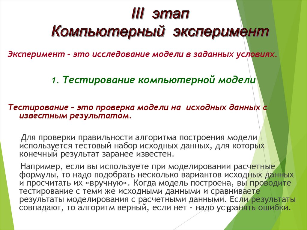 Эксперимент – это исследование модели в заданных условиях.1. Тестирование компьютерной модели