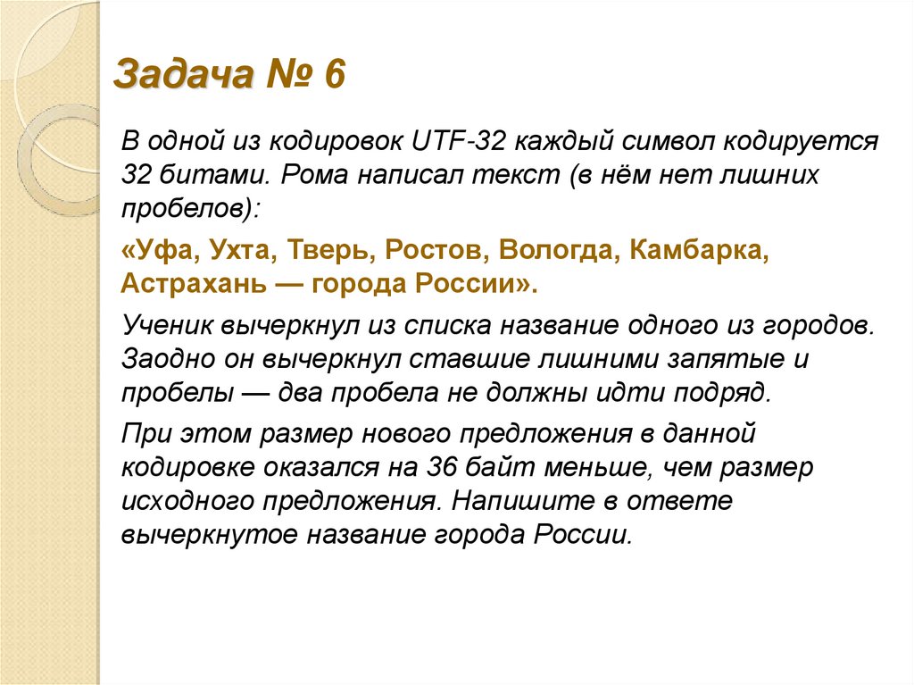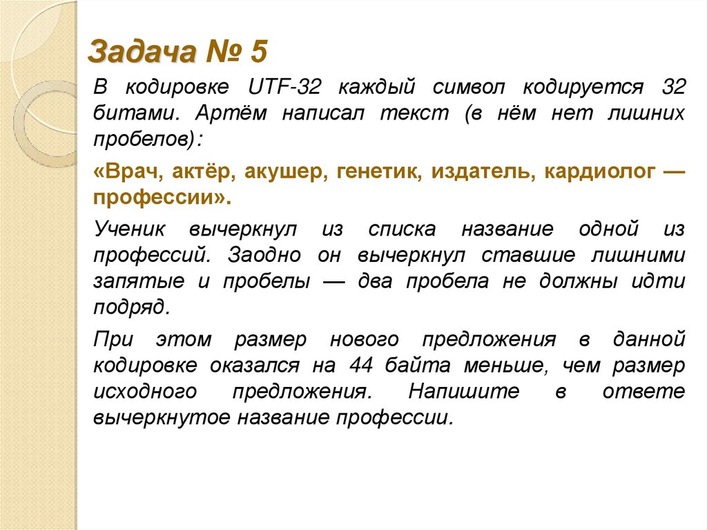 Задача № 5В кодировке UTF-32 каждый символ кодируется 32