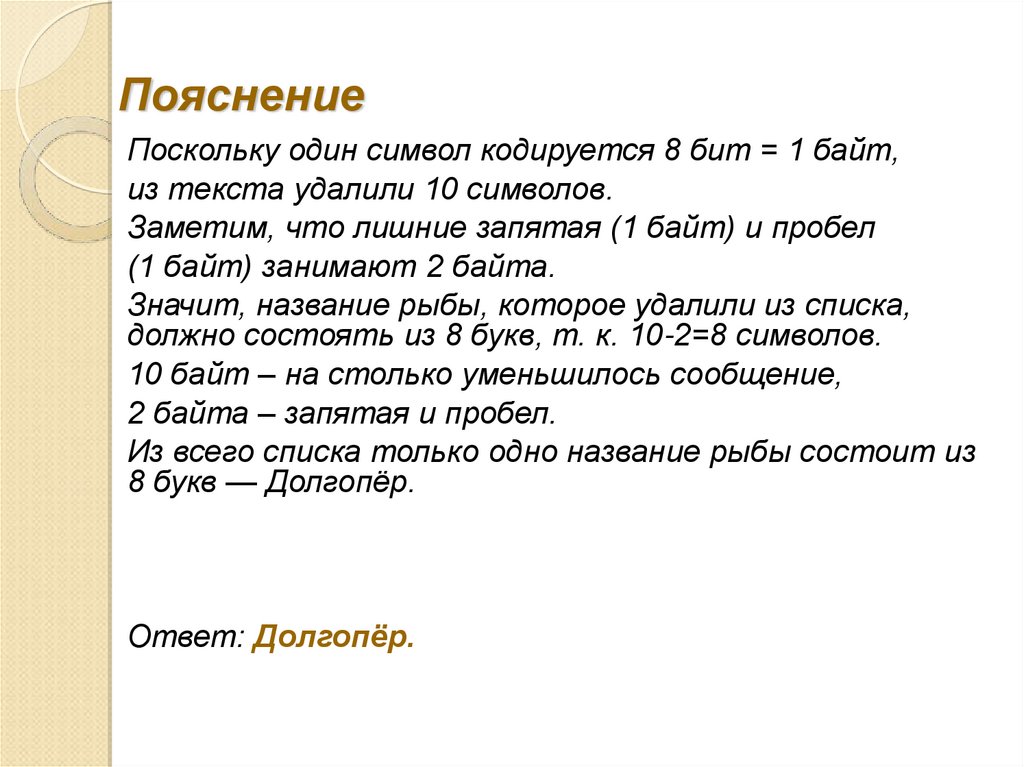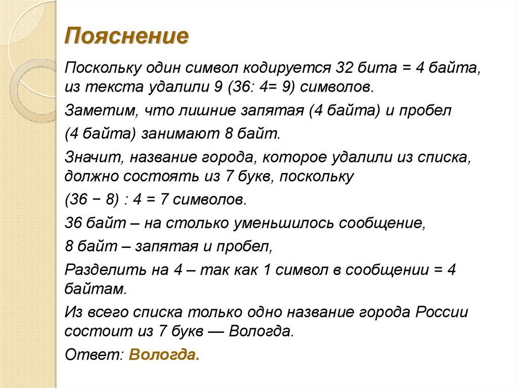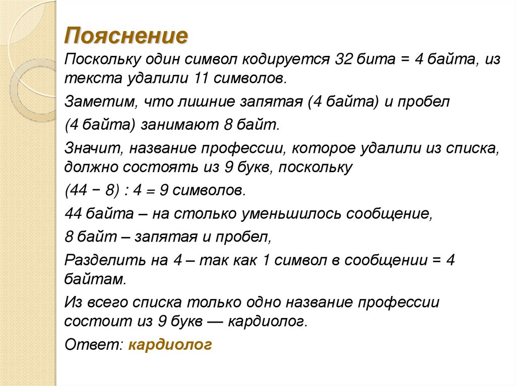 ПояснениеПоскольку один символ кодируется 8 бит = 1 байт,