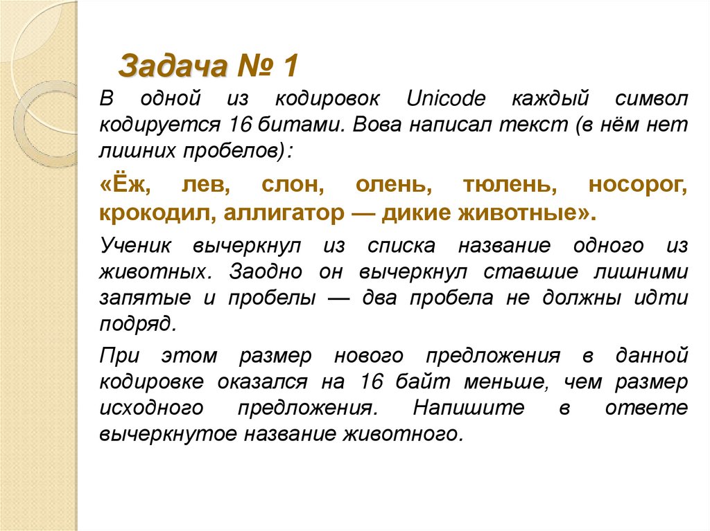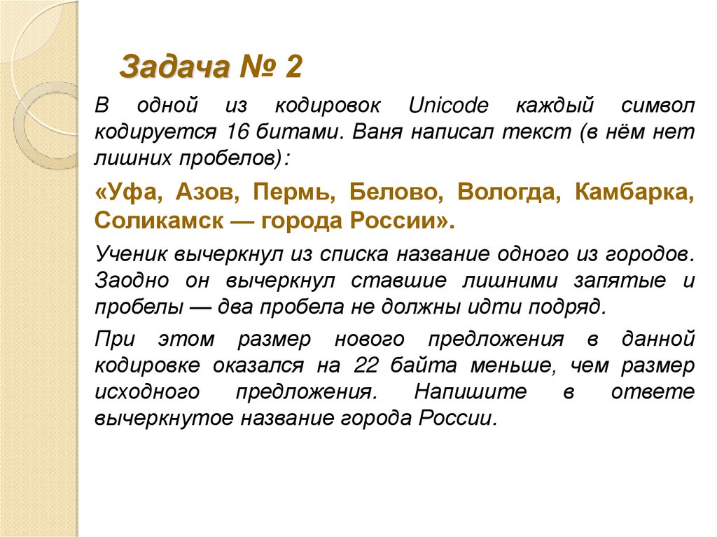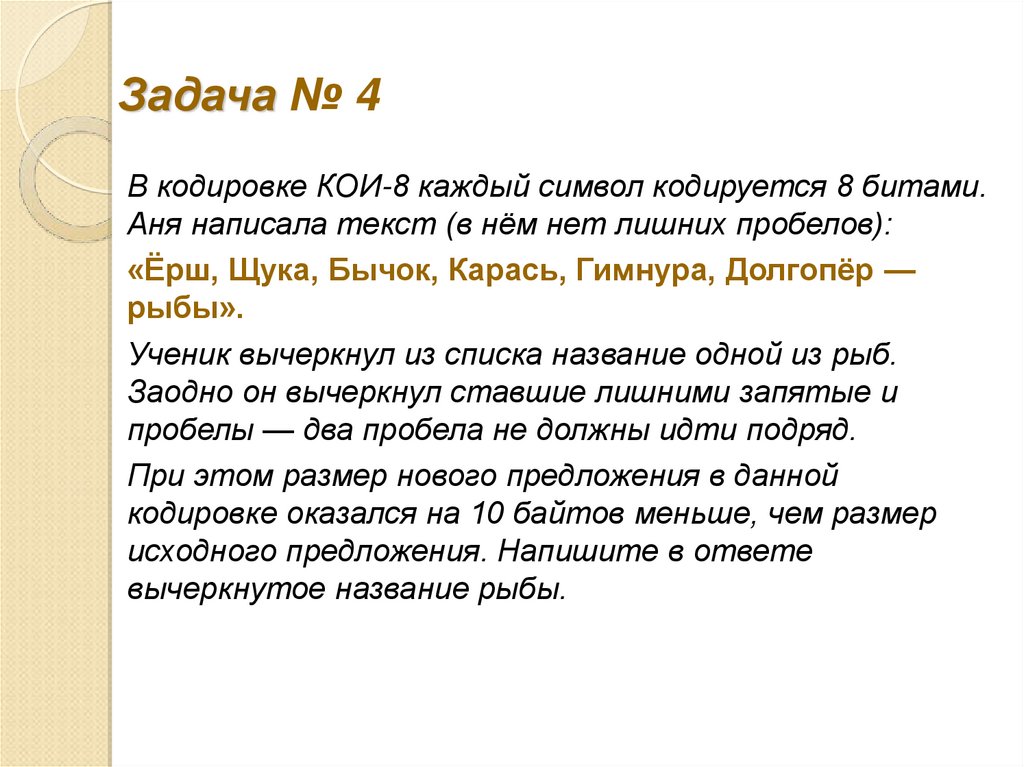 Задача № 4В кодировке КОИ-8 каждый символ кодируется 8 битами.