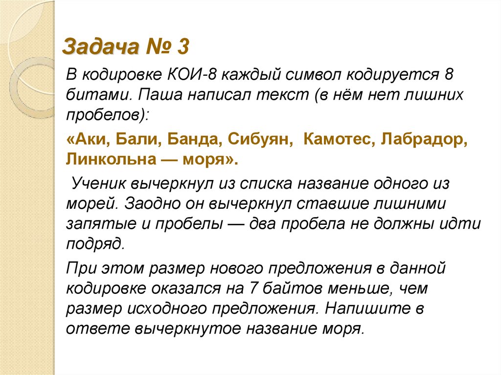 Задача № 3В кодировке КОИ-8 каждый символ кодируется 8