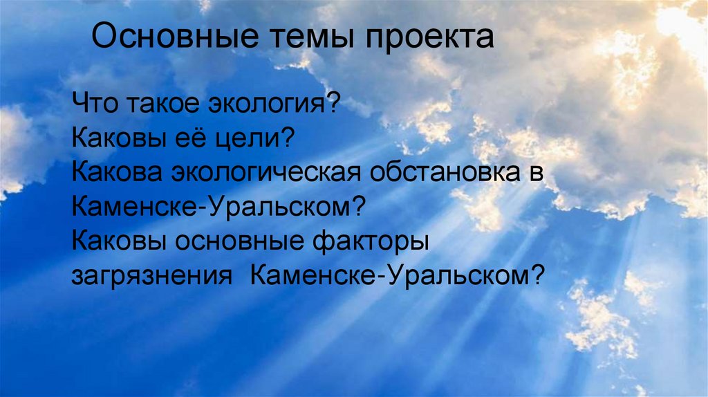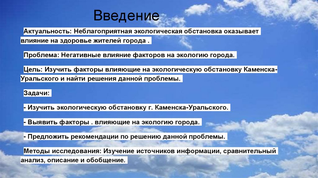 Цель: Изучить факторы влияющие на экологическую обстановку КаменскаУральского и найти решения данной проблемы.