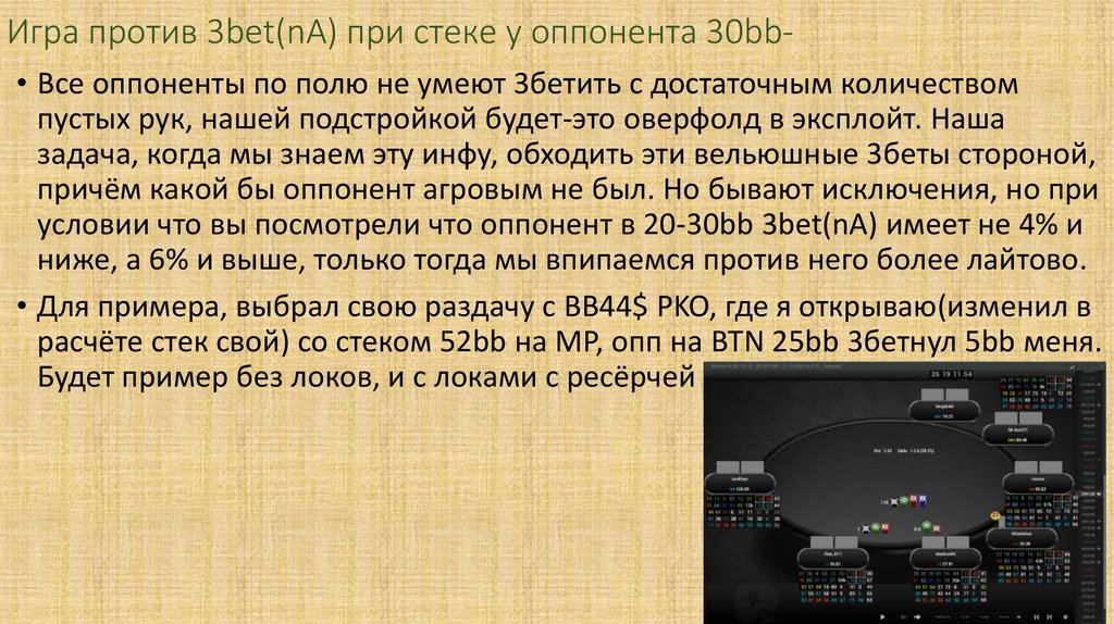 Игра против 3bet(nA) при стеке у оппонента 30bb• Все оппоненты по полю не умеют 3бетить с достаточным количествомпустых рук, нашей подстройкой будет-это оверфолд в эксплойт. Наша