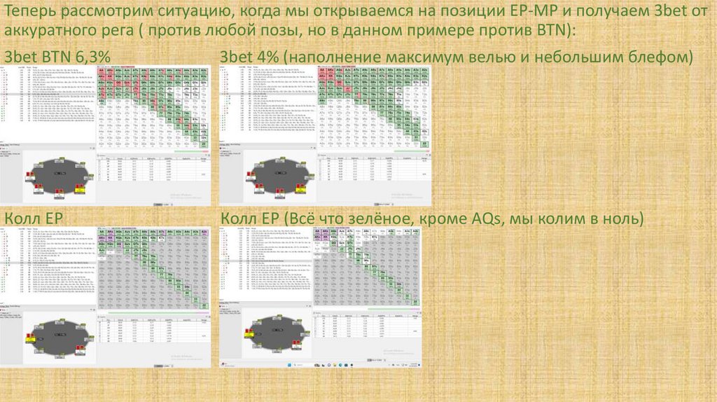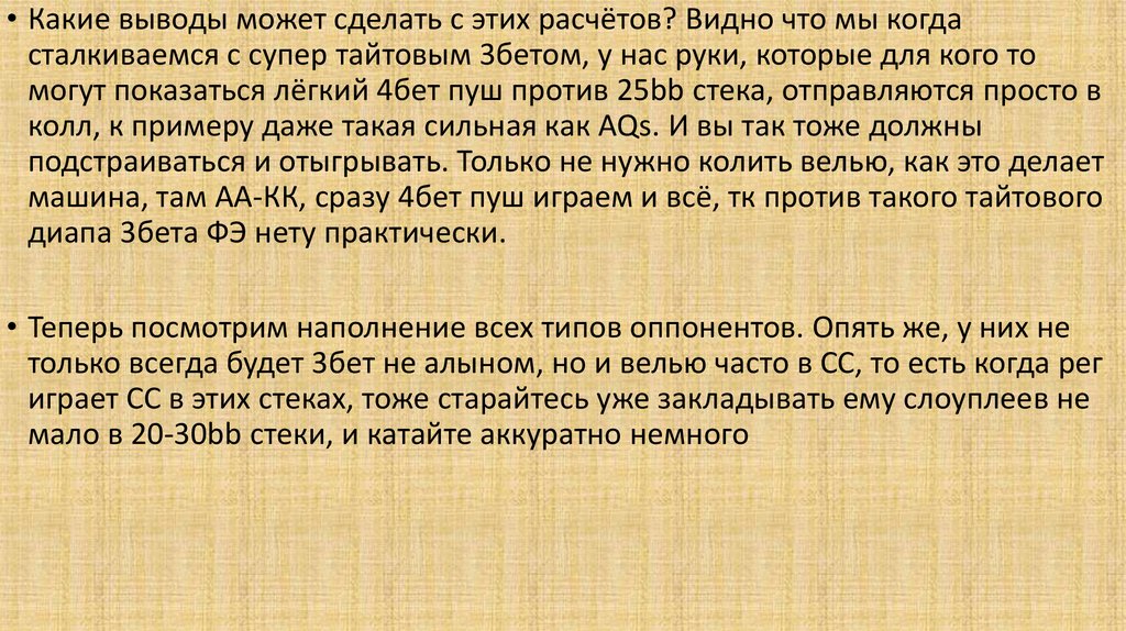 • Какие выводы может сделать с этих расчётов? Видно что мы когдасталкиваемся с супер тайтовым 3бетом, у нас руки, которые для кого то