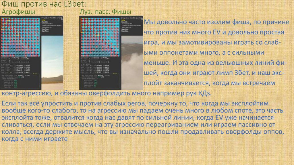 меньше. И эта одна из вельюшных линий фишей, когда они играют лимп 3бет, и наш эксплойт заканчивается, когда мы встречаем