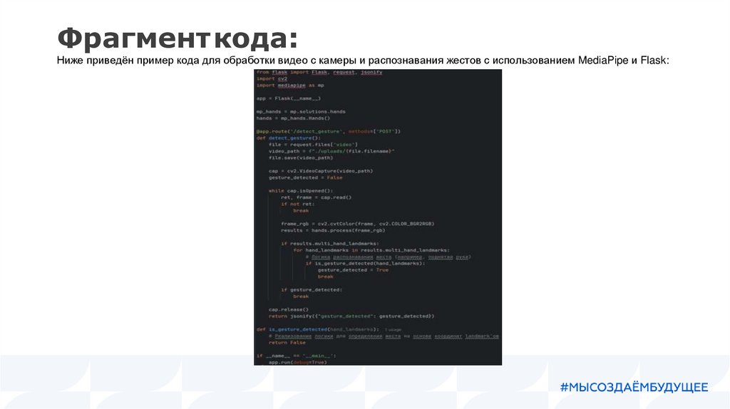 Фрагменткода:Ниже приведён пример кода для обработки видео с камеры и распознавания жестов с использованием MediaPipe и Flask: